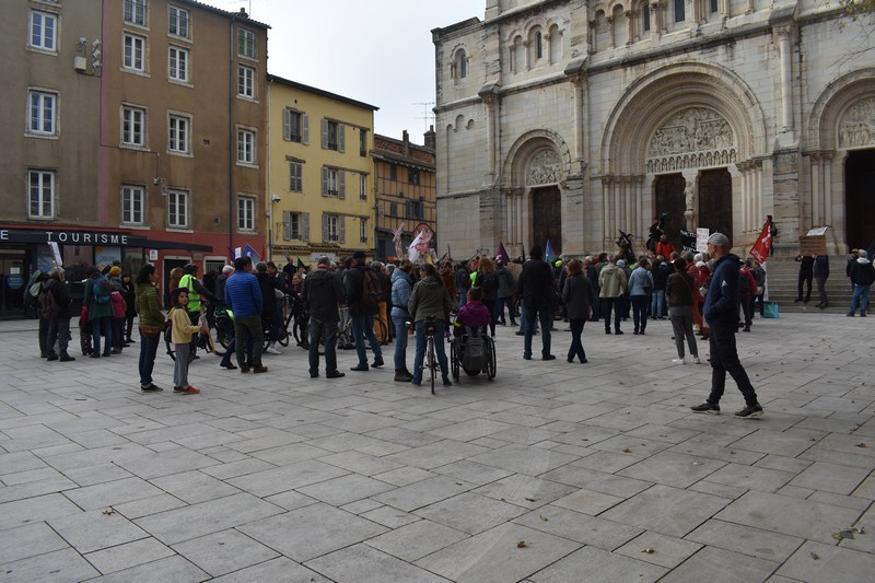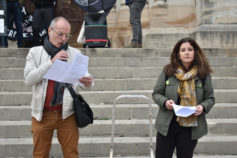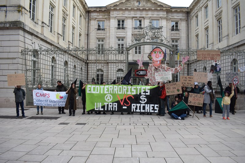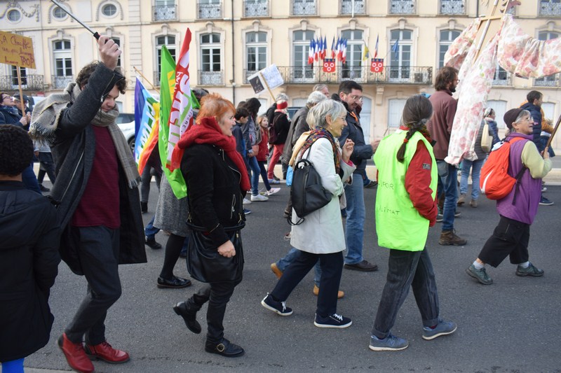 Trois cents personnes présentes dès 14h place Saint-Pierre suite à l’appel d’Attac Mâcon, de Mâcon Citoyens, de Refondation 71, de GRS 71, d’EELV, de LFI, du PG, de “Pas d’Eclat” (contre le projet de parc d’attraction à Tournus), des PS, PCF, CMPS, d’ EcoLogicAction 71 (contre les Center Parcs de Bourgogne-Franche-Comté), et de “La confédération paysanne”.