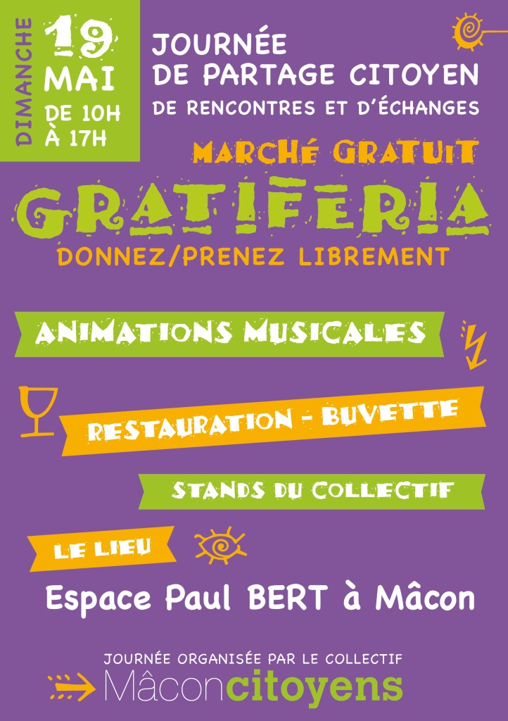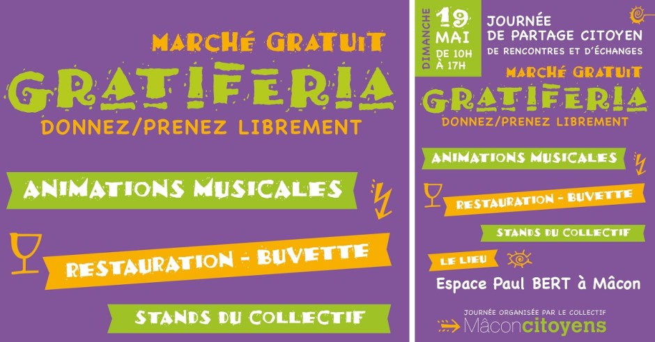 Dépôt des objets à donner : Vous pouvez tout nous déposer au centre Paul Bert de Mâcon : la veille de la Gratiferia, le samedi 18 mai de 13 h 30 à 16 h 30 ou le jour même, le dimanche 19 mai, de 9 h à 12 h. Emaballez de préférence sous cartons avec si possible indication de la nature des objets. Une table à l’accueil de la Gratiféria sera mise en place pour la réception et le tri des objets apportés. Les membres de l’organisation se réservent le droit de refuser des objets qui ne répondraient pas aux critères fixés. Les objets refusés devront alors être remportés par leurs donateurs.
