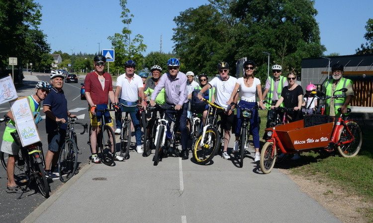 Le maire (au centre avec le casque bleu) accompagné d’adjoints de la majorité et de l’association Mâcon vélo en ville.